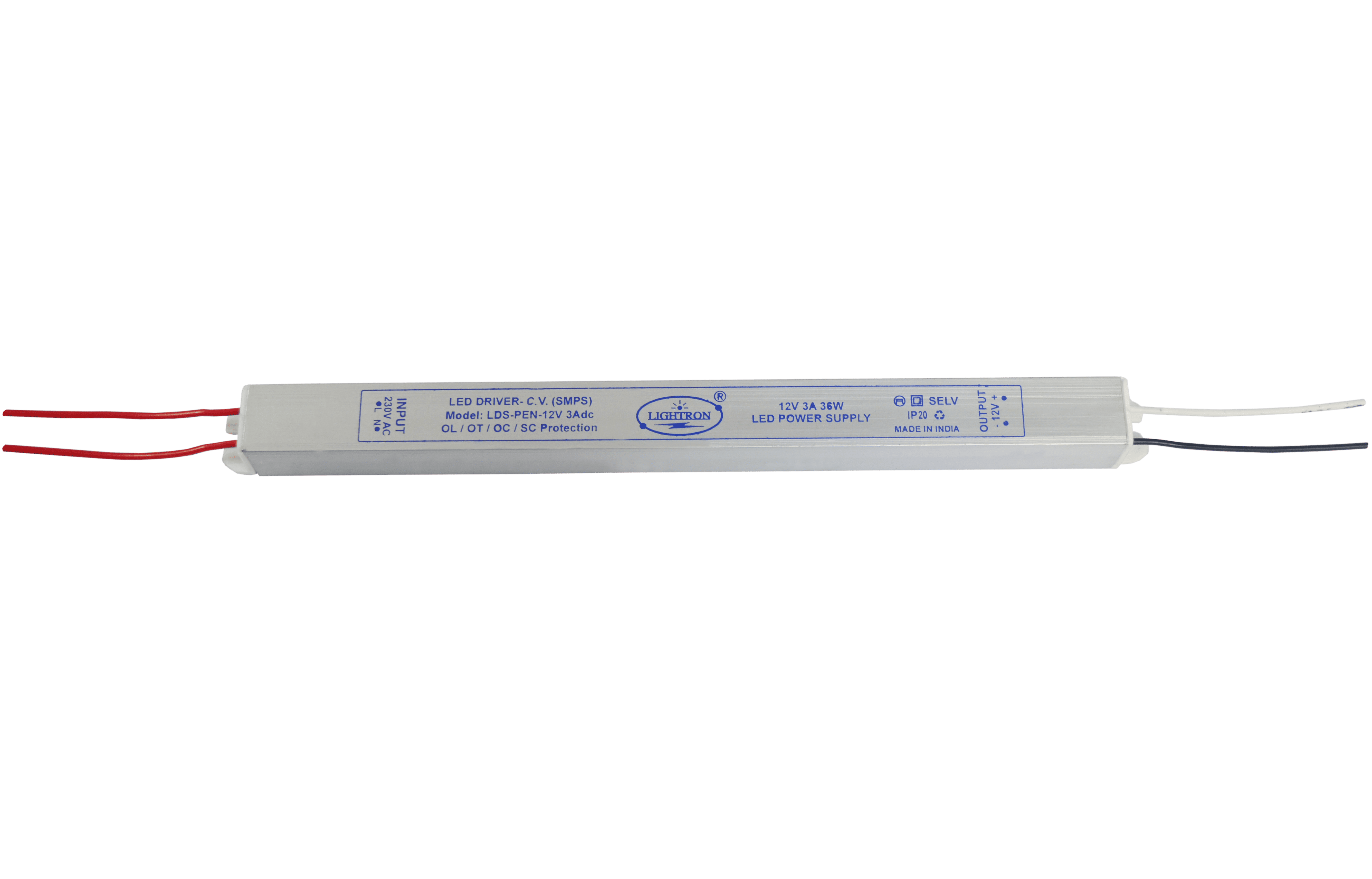12V CONSTANT VOLTAGE LED DRIVERS (PENCIL SUPER SERIES- SMPS) FOR LED STRIP & SIGNAGE MODULES are a type of power supply that converts AC from a mains power source to 24V Dc output specially designed for input power to LED Strips etc. This Pencil series is very Sleek in shape & size suitable for installation in very narrow spaces like Aluminum Profile Linear Lights. These High Efficiency Constant Volatage Driver (SMPS) have output Open Circuit, Short circuit, Over load and Over temprature protections.